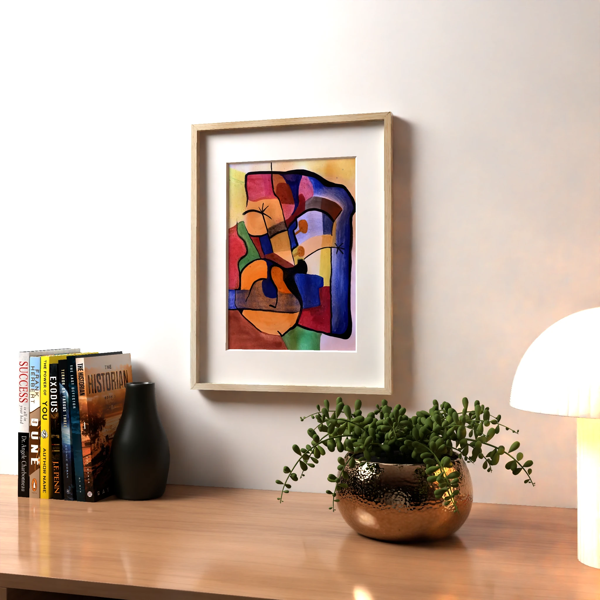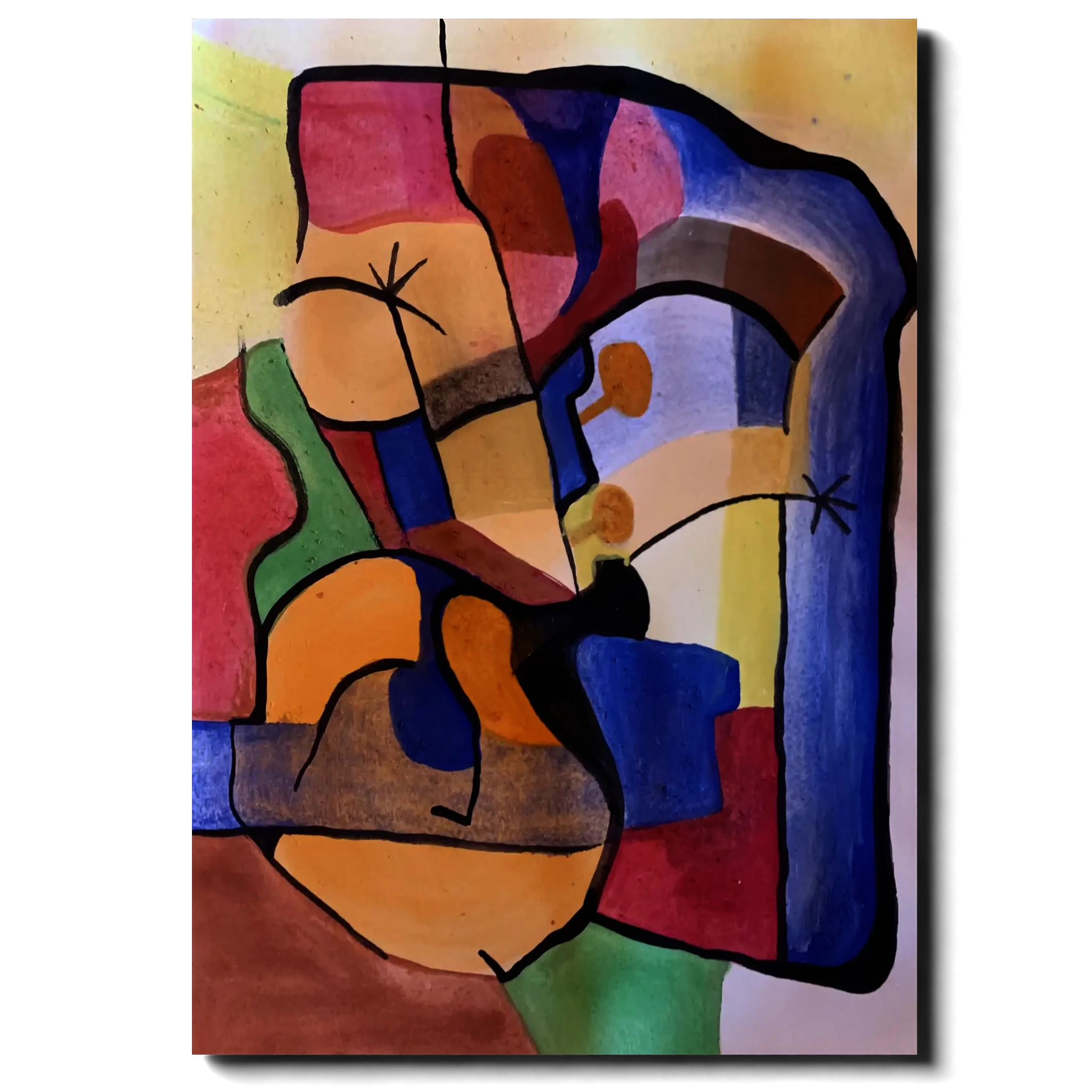 A woman in her sundress Gouache on paper, 21x30cm Arnaud Quercy Creations / AQC0416/ 2022 This vibrant gouache painting, titled ‘A Woman in Her Sundress,’ captures the essence of summer through bold colors and fluid forms. The composition features a dynamic interplay of shapes and hues, with rich blues, warm yellows, and earthy tones. The abstract representation of the woman in her sundress evokes a sense of movement and joy, reflecting the carefree spirit of a sunlit day. The use of thick black lines adds definition and contrast, enhancing the overall vibrancy of the piece. Through this artwork, the artist celebrates the beauty and simplicity of a moment, inviting viewers to experience the warmth and liveliness of summer.