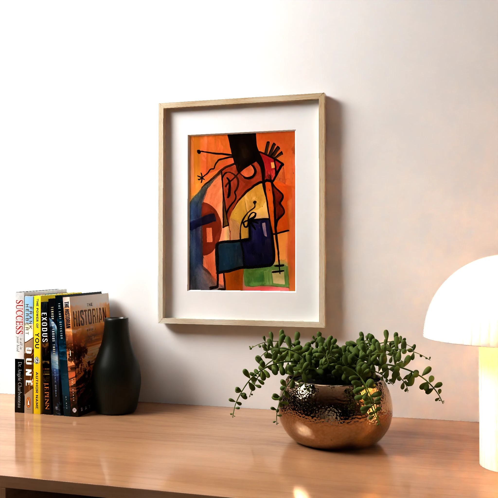 The lady at the café, Paris Gouache on paper, 21x30cm Arnaud Quercy Creations / AQC0417/ 2022 This expressive gouache painting, titled ‘The Lady at the Café, Paris,’ captures the quintessential Parisian scene through vibrant colors and abstract forms. The composition features a dynamic array of hues, including warm oranges, rich blues, and earthy tones, creating a lively and inviting atmosphere. The abstract depiction of the lady, with her distinctive posture and surrounding café elements, evokes a sense of casual elegance and urban charm. The use of bold black lines adds definition and movement, enhancing the overall vibrancy and energy of the piece. Through this artwork, the artist invites viewers to experience the everyday beauty and sophistication of Parisian life.