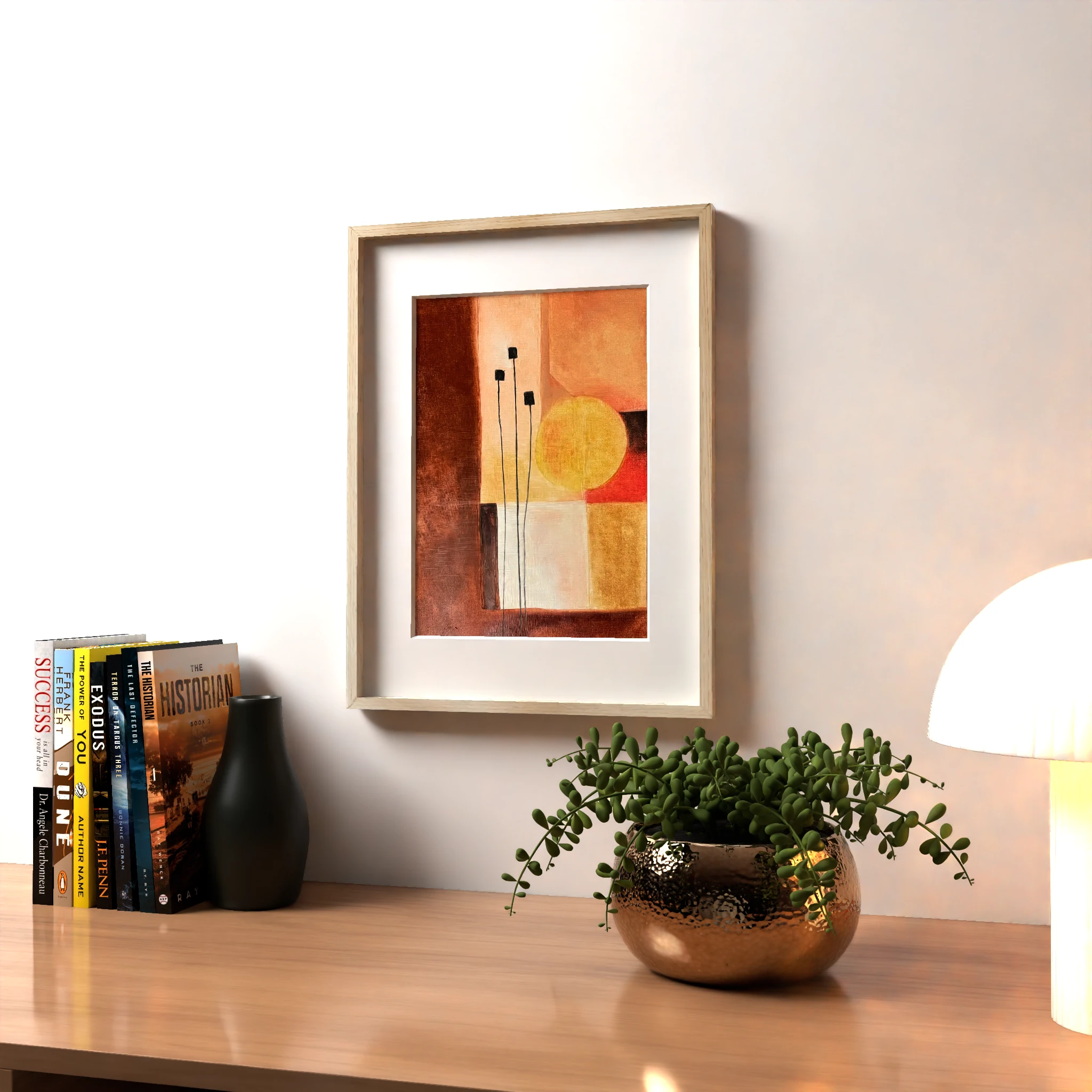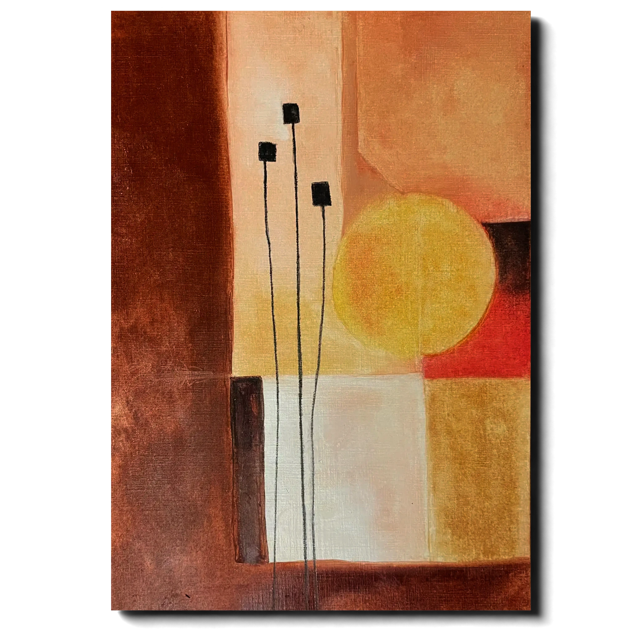 New Mexico – The Three Sisters Legend Oil pastel on paper, 21x29cm Arnaud Quercy Creations / AQC0464 / 2023 This evocative oil pastel painting, titled ‘New Mexico – The Three Sisters Legend,’ captures the rich cultural heritage and natural beauty of New Mexico. The composition features warm, earthy tones of brown, orange, and yellow, reflecting the arid landscapes and vibrant sunsets of the region. The three vertical lines symbolize the Three Sisters, a legend of the Native American agriculture triad of corn, beans, and squash. The geometric shapes and abstract forms evoke the timeless and enduring connection to the land and its traditions. Through this artwork, the artist celebrates the mystical and cultural essence of New Mexico, inviting viewers to explore its unique and storied past.