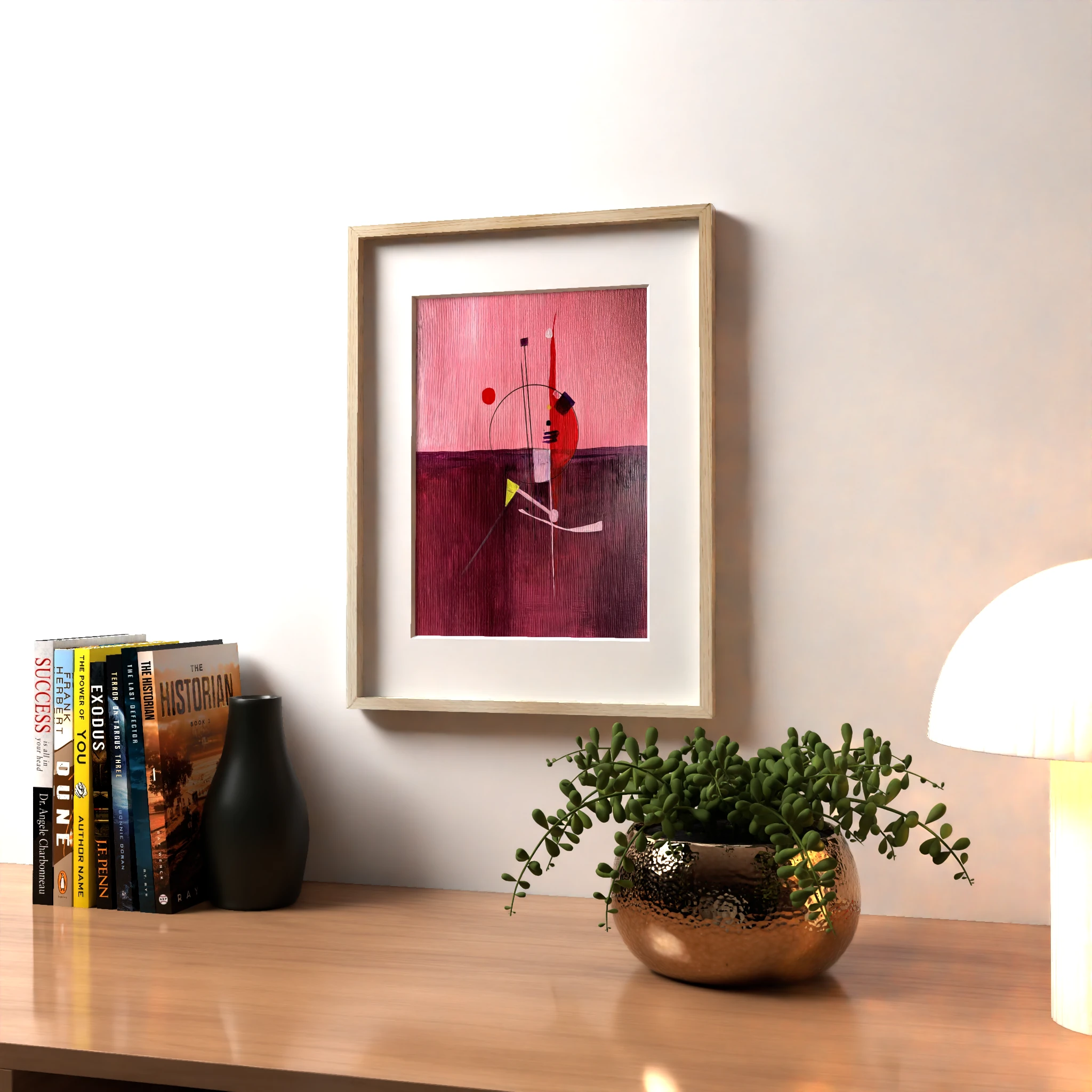 Metaboles Acrylic on paper, 21×29.5cm Arnaud Quercy Creations / AQC0486 / 2023 This abstract artwork, inspired by the musical concept of metabole, visually embodies the fluidity and transformation found in a musical modulation. The painting features a harmonious interplay of geometric shapes and vibrant colors, dominated by shades of pink and deep maroon, with accents of yellow, white, and purple. The central elements, including intersecting lines, circles, and squares, create a dynamic and rhythmic composition, evoking the sense of movement and change akin to a shifting musical key.