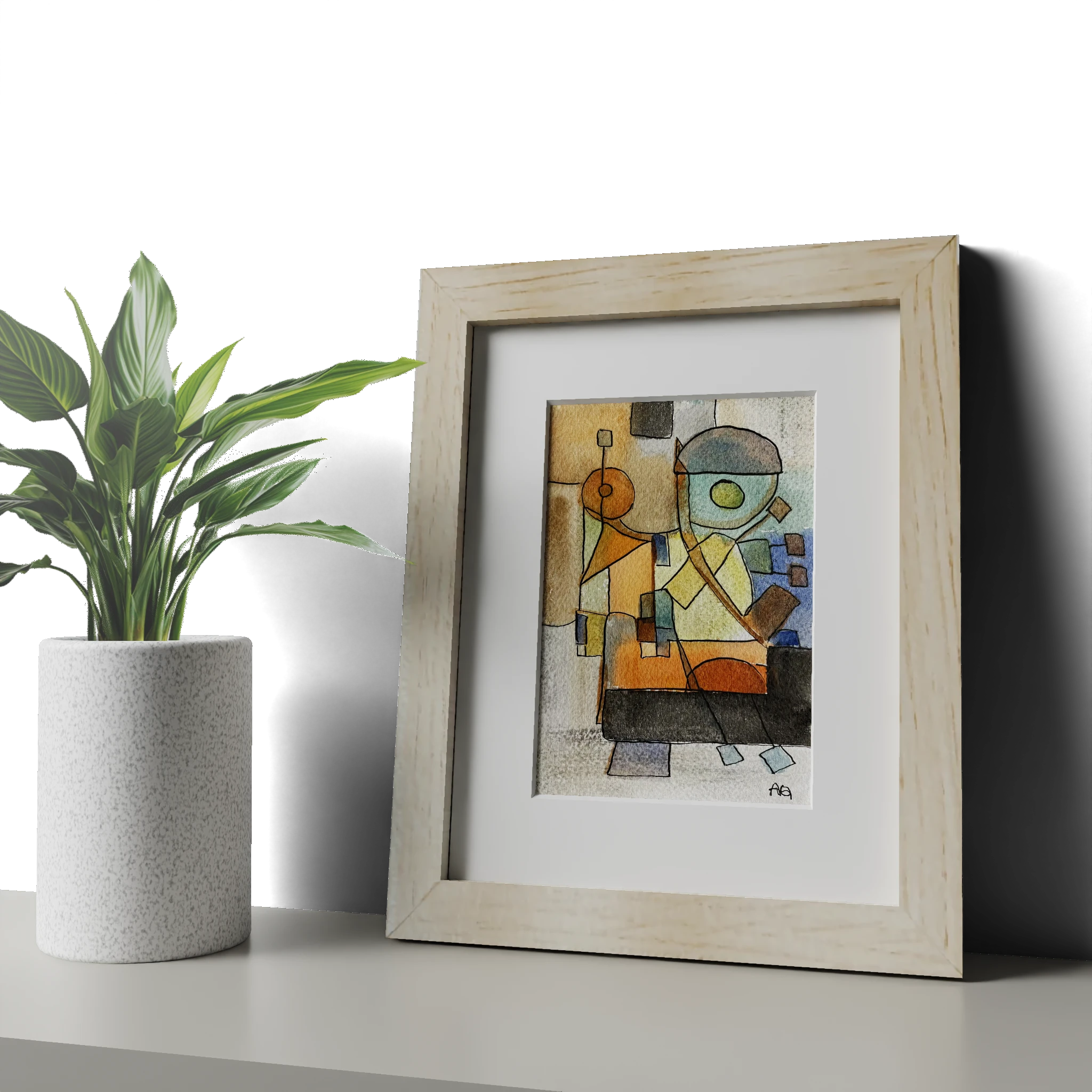 Le chant du Chardonneret élégant Aquarelle et encre sur papier, 10.5×14.8cm Arnaud Quercy Creations / AQC0509 / 2024 The painting is an abstract/cubist representation, possibly evoking the melody and rhythm of a goldfinch’s song through the interplay of shapes and lines. A variety of colors, such as earth tones, blues, and greys, are juxtaposed with the ink outlines to create a sense of harmony and movement, reminiscent of the bird’s elegant and fluid song patterns. The composition may also subtly hint at the forms or the environment associated with the goldfinch, allowing the viewer to interpret the visual cues in connection with the title.
