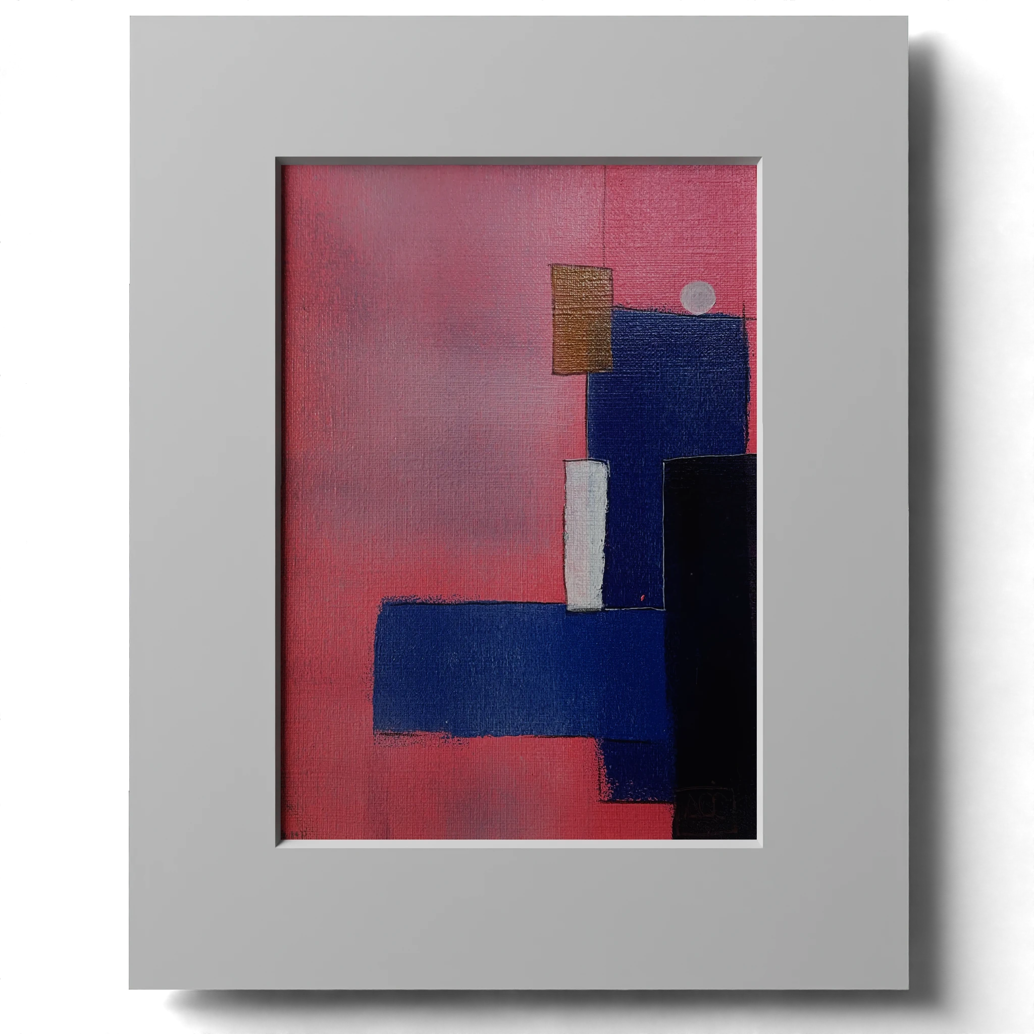 Ab Major 9 – Research on Harmony, variation 5 Acrylic on paper, 14.8x21cm Arnaud Quercy Creations / AQC0537 / 2024 This painting explores the harmony of the Ab Major chord through the interplay of colors: blue (Ab), pink (C), and purple-blue (Eb). By translating musical notes into visual elements, the artist bridges sound and sight, creating a harmonious composition that reflects the essence of Ab Major 9. The geometric shapes and layered colors symbolize the structured yet expressive nature of musical harmony, offering a visual representation of auditory beauty. This piece is part of the synesthetic collection where the artist maps colors to the circle of fifths, merging the sensory experiences of color and music. Examples of famous musical pieces composed in Ab Major include Franz Schubert’s ‘Impromptu in Ab Major, Op. 90, No. 4’ and John Coltrane’s jazz classic ‘Naima.’