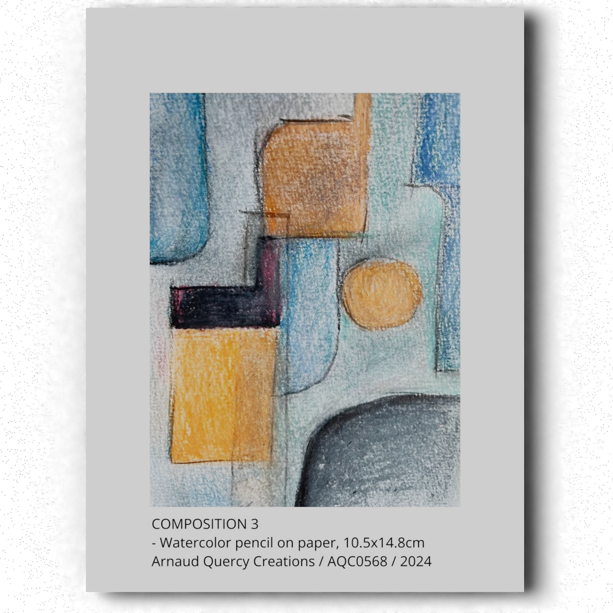 Composition 3 Watercolor pencil on paper, 10.5×14.8cm Arnaud Quercy Creations / AQC0568 / 2024 ‘Composition 3’ is an engaging abstract piece that explores the interplay of shapes and colors using watercolor pencils on paper. The artwork features a harmonious blend of cool and warm tones, with shades of blue, orange, and gray creating a rich and textured visual experience. The geometric forms and overlapping layers add depth and complexity to the composition. The use of watercolor pencils allows for subtle gradations and a delicate, yet vibrant, color palette. The juxtaposition of organic and structured shapes invites the viewer to explore the balance between chaos and order within the artwork. This piece is part of Arnaud Quercy’s ongoing exploration of abstract art, where he examines the relationships between color, form, and texture. ‘Composition 3’ encourages viewers to engage with the artwork on a personal level, discovering their own interpretations and connections within the abstract forms.