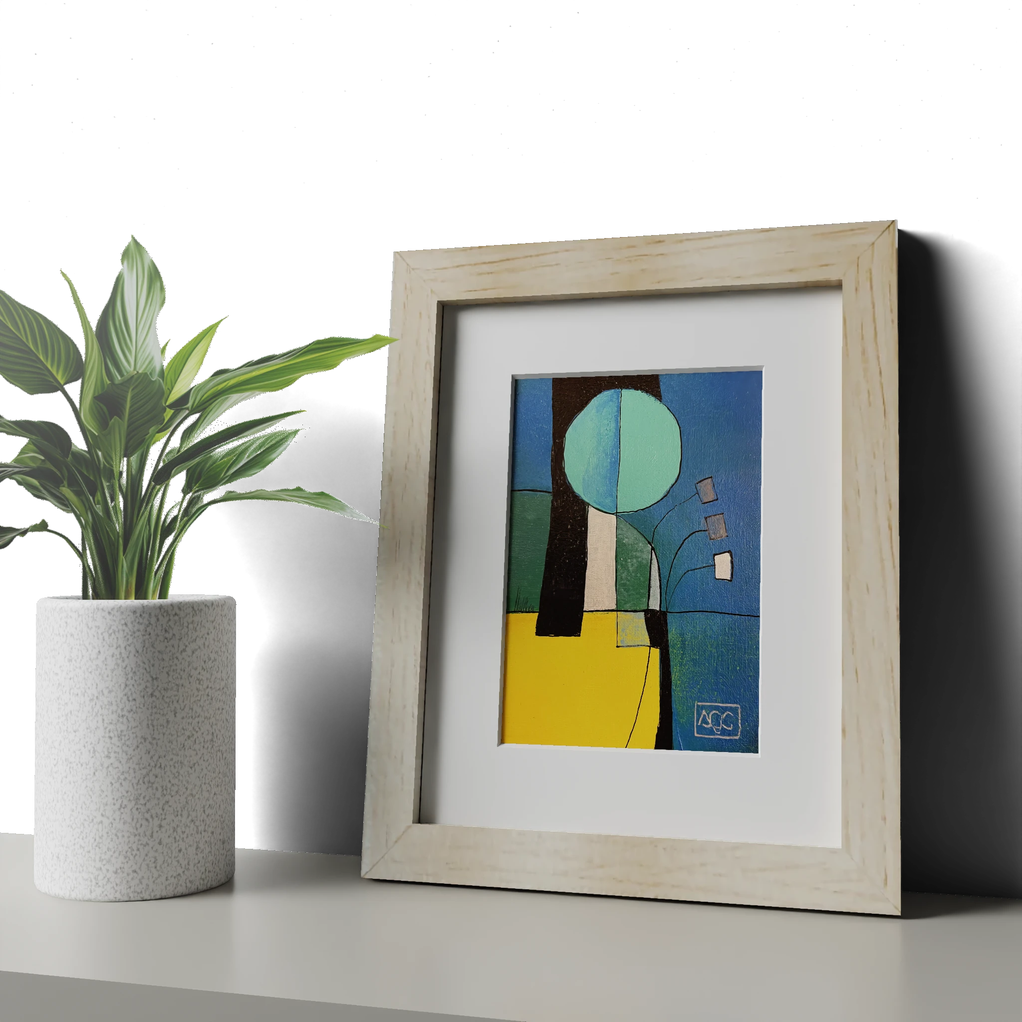 C#min – Research on Harmony – Variation 1 Acrylic on paper, 10.5x16cm Arnaud Quercy Creations / AQC0624 / 2024 This painting explores the harmony of the C# minor chord through the interplay of colors: blue-green (C#), yellow (E), and light blue (G#). By translating musical notes into visual elements, the artist bridges sound and sight, creating a harmonious composition that reflects the essence of C# minor. The geometric shapes and layered colors symbolize the structured yet expressive nature of musical harmony, offering a visual representation of auditory beauty. This piece is part of the synesthetic collection where the artist maps colors to the circle of fifths, merging the sensory experiences of color and music. Examples of famous musical pieces composed in C# minor include Frédéric Chopin’s ‘Prelude in C# minor, Op. 45 and John Coltrane’s jazz classic ‘Equinox.’