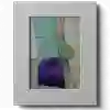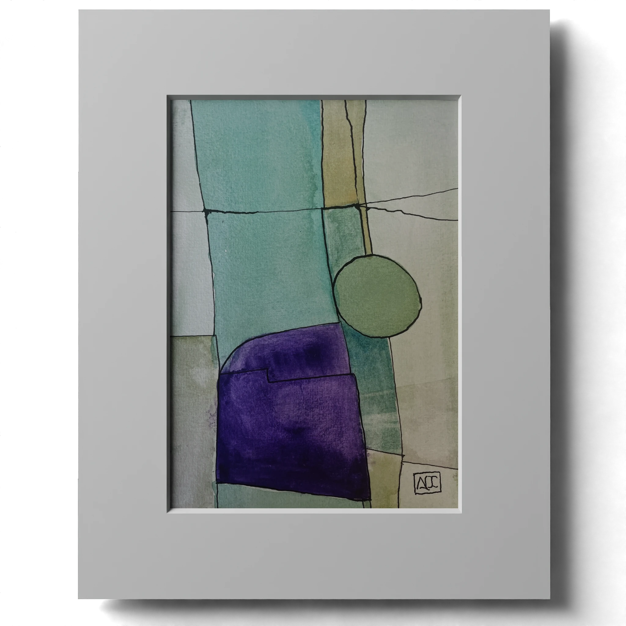 The painting features a palette of earthy greens, deep violets, and subtle ochres, reflecting the textures and tones of ancient stone walls, sunlit facades, and shaded courtyards. The bold, angular forms suggest the terraced cliffs and architectural layers of the town, while the circular shape hints at the continuity of time and tradition.
