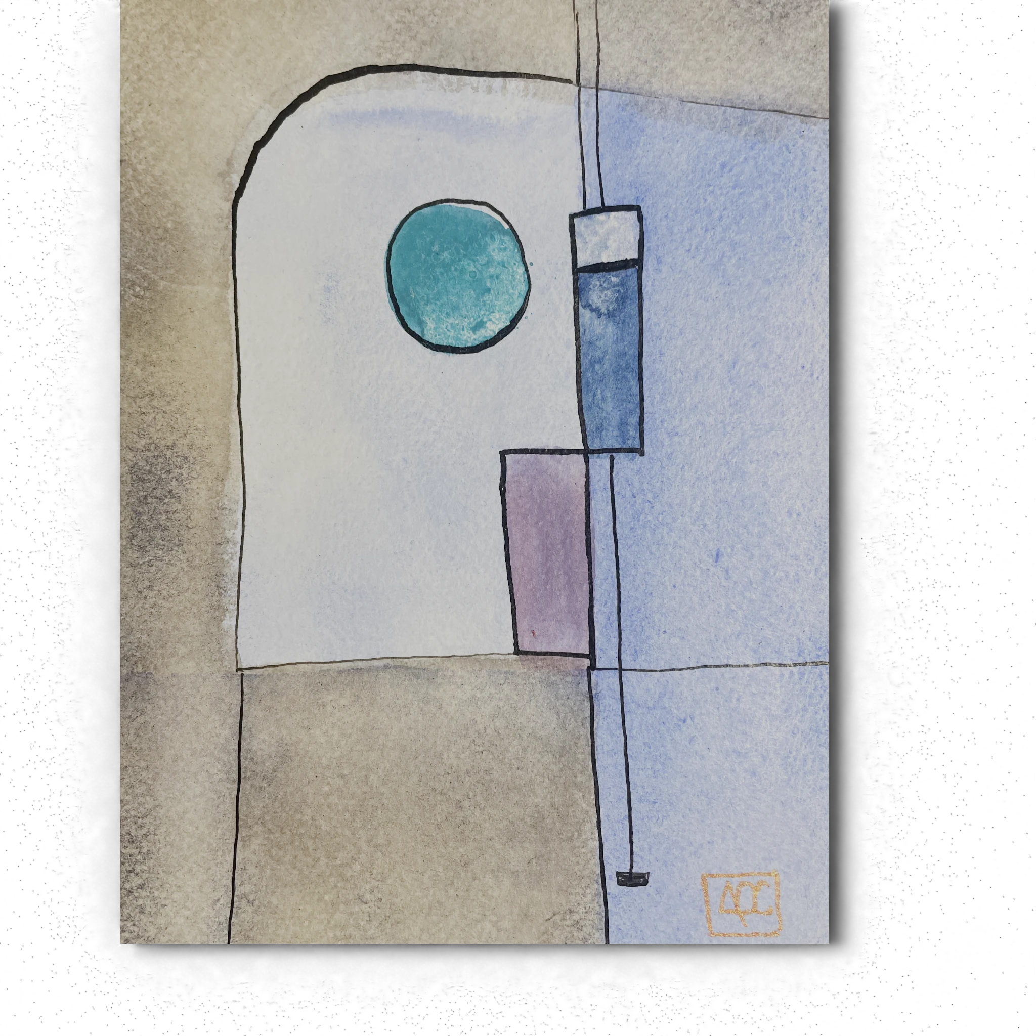 Ab Octaves – Reflexions 14 Watercolor on paper, 16x24cm Arnaud Quercy Creations / AQC0679 / 2024 This painting explores the note Ab in octaves through the interplay of shades of blue. By translating musical notes into visual elements, the artist bridges sound and sight, creating a harmonious composition that reflects the essence of Ab. The geometric shapes and layered colors symbolize the structured yet expressive nature of musical harmony, offering a visual representation of auditory beauty. This piece is part of the synesthetic collection where the artist maps colors to the circle of fifths, merging the sensory experiences of color and music. In music, octaves are intervals where the higher note has double the frequency of the lower, creating a sense of unity and completeness. They are fundamental to musical structure, providing a foundation for harmony and melody. In this painting, the octaves of Ab are visually represented through varying shades of blue, capturing the depth and richness of this musical interval, and reflecting its role in creating a cohesive and resonant auditory experience.