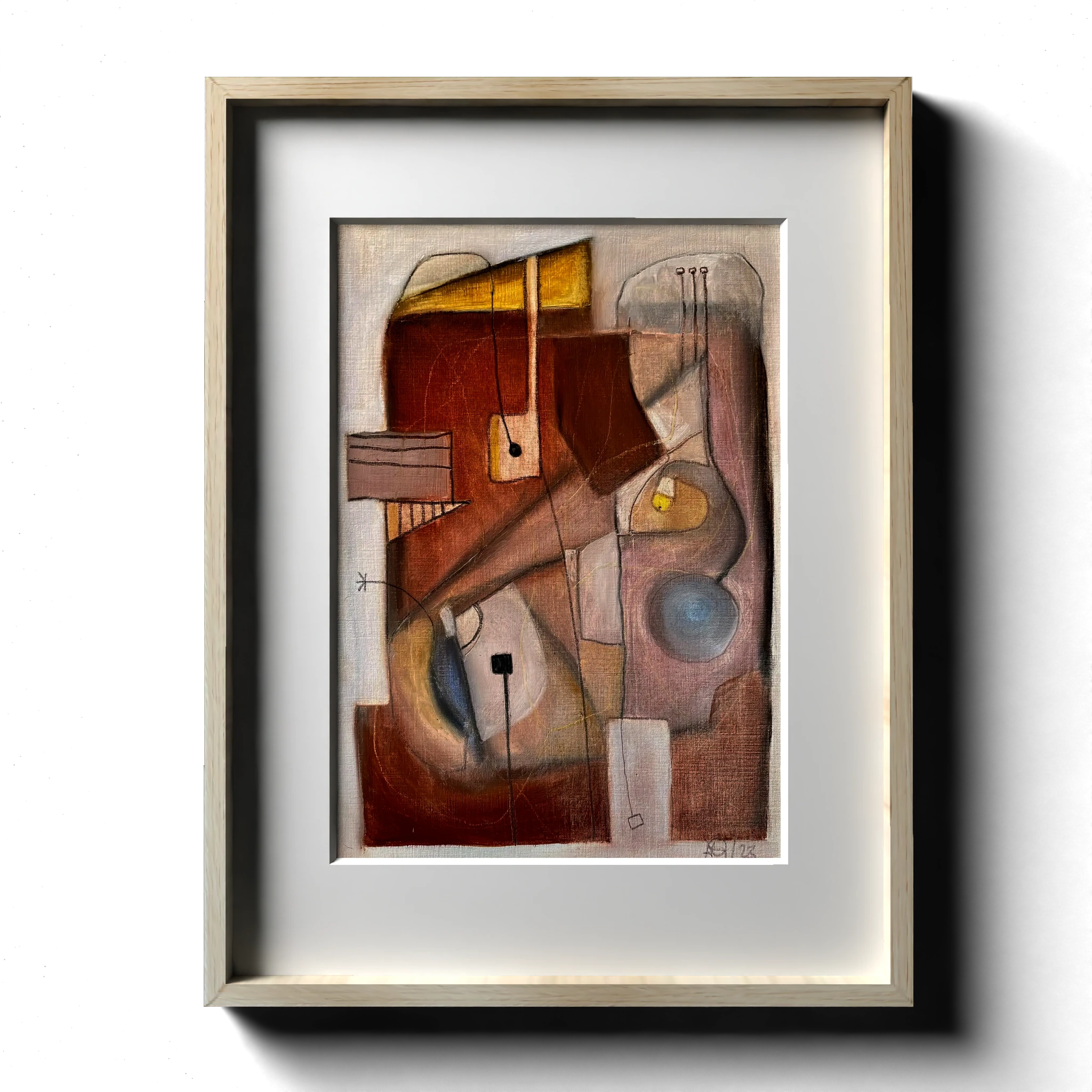 In Whispers of Solitude, Arnaud Quercy offers a contemplative vision of quietude through soft abstraction and subtle chromatic balance. Rendered in oil pastels, the piece blends warm browns, dusty pinks, and pale yellows to create a space where silence becomes expressive. The forms do not dominate—they coexist, conversing gently across the surface in a muted visual dialogue.