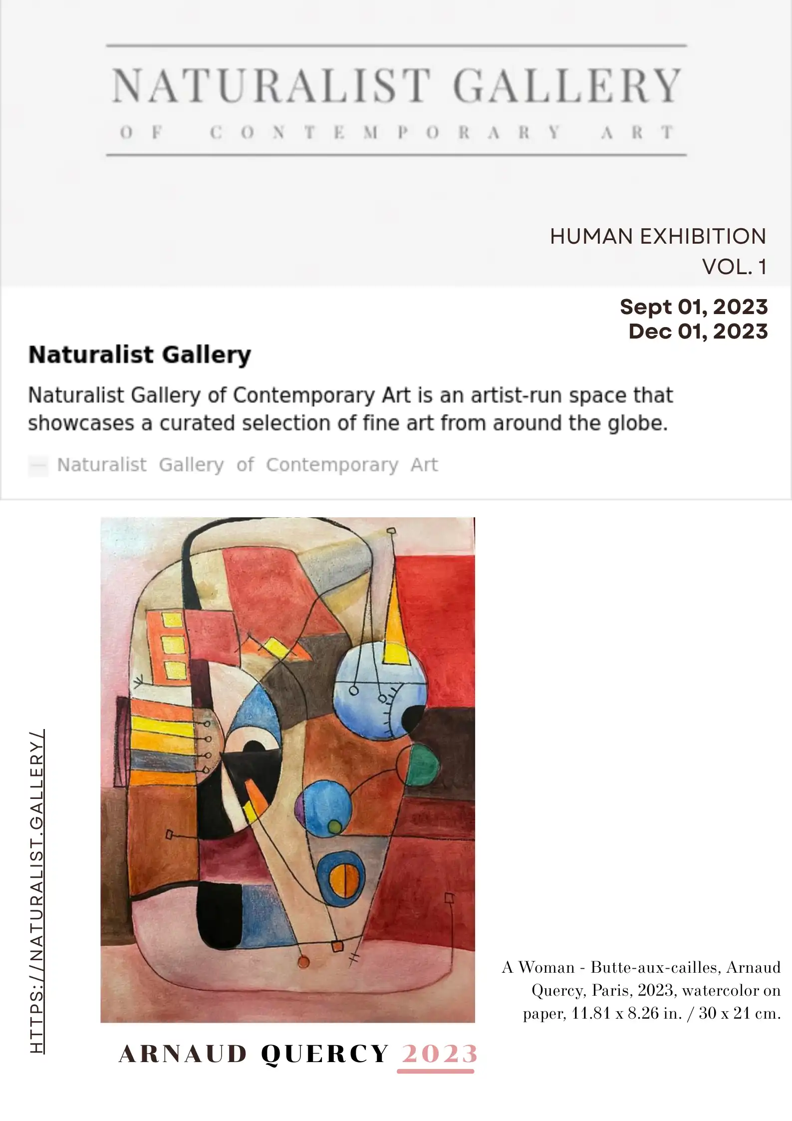 In A Woman – Variation 1, Arnaud Quercy presents a fragmented portrait rendered in watercolor—a visual poem composed of curves, geometry, and muted tension. Exhibited in Human Exhibition Vol. 1 at the Naturalist Gallery of Contemporary Art, this piece speaks to the theme of identity as seen through the eyes of the artist: layered, emotional, and partially veiled.